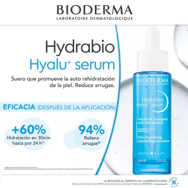 Primer sérum ecobiológico hidratante con efecto rellenador, que previene los primeros signos de envejecimiento. Regenerador, de hidratación intensa para todas las pieles deshidratadas que contiene alto y bajo peso molecular de ácido hialurónico y niacinamida. Inspirado en el enfoque de ecobiología NAOS, y gracias a su comprensión de la disfunción biológica responsable de la deshidratación, Hydrabio Hyalu+ le permite a la piel reactivar sus mecanismos naturales de hidratación y retener el agua esencial para su equilibrio.