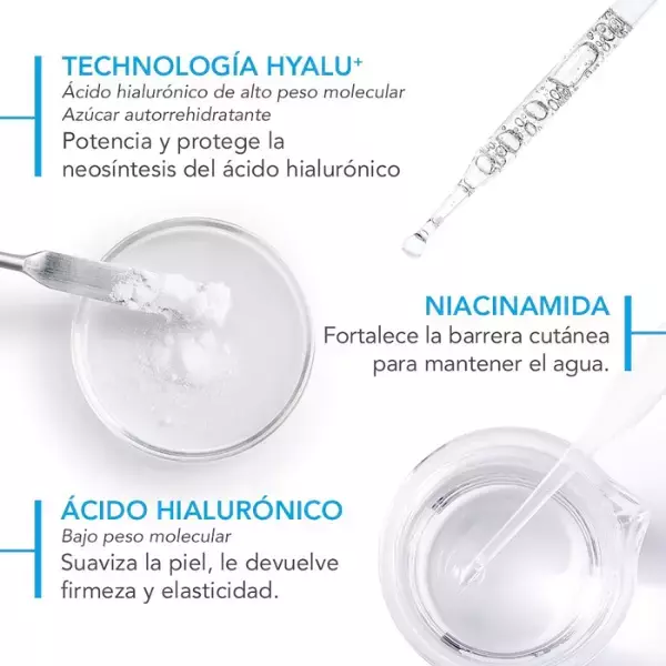 -Acción hidratante y efecto relleno inmediato: ácido hialurónico de alto peso molecular (HMW) que crea una película en la superficie evitando la pérdida de agua, además de un nuevo azúcar autorrehidratante que ayuda a la piel a sintetizar y conservar el ácido hialurónico.