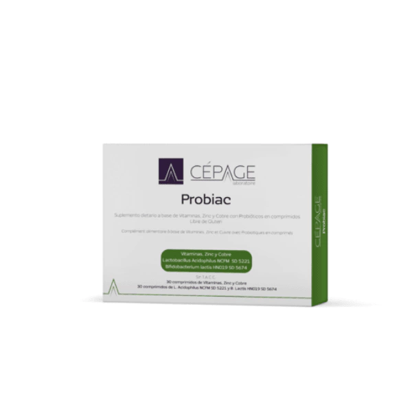 Descripción: Probiac es un suplemento dietario a base de Vitaminas, Zinc y Cobre con Probióticos en comprimidos . Libre de Gluten